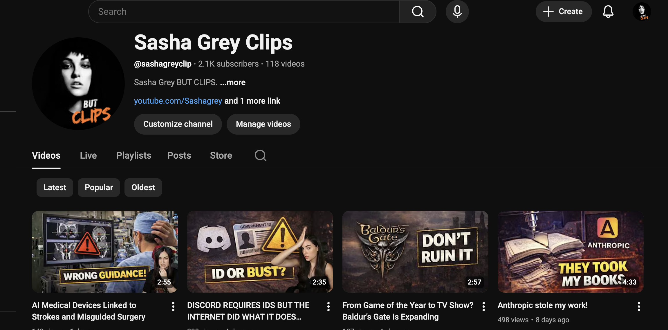 Check out the new channel! Working on getting the URL handle updated to match the rest of the social media links though! https://www.youtube.com/@sashagreyclip